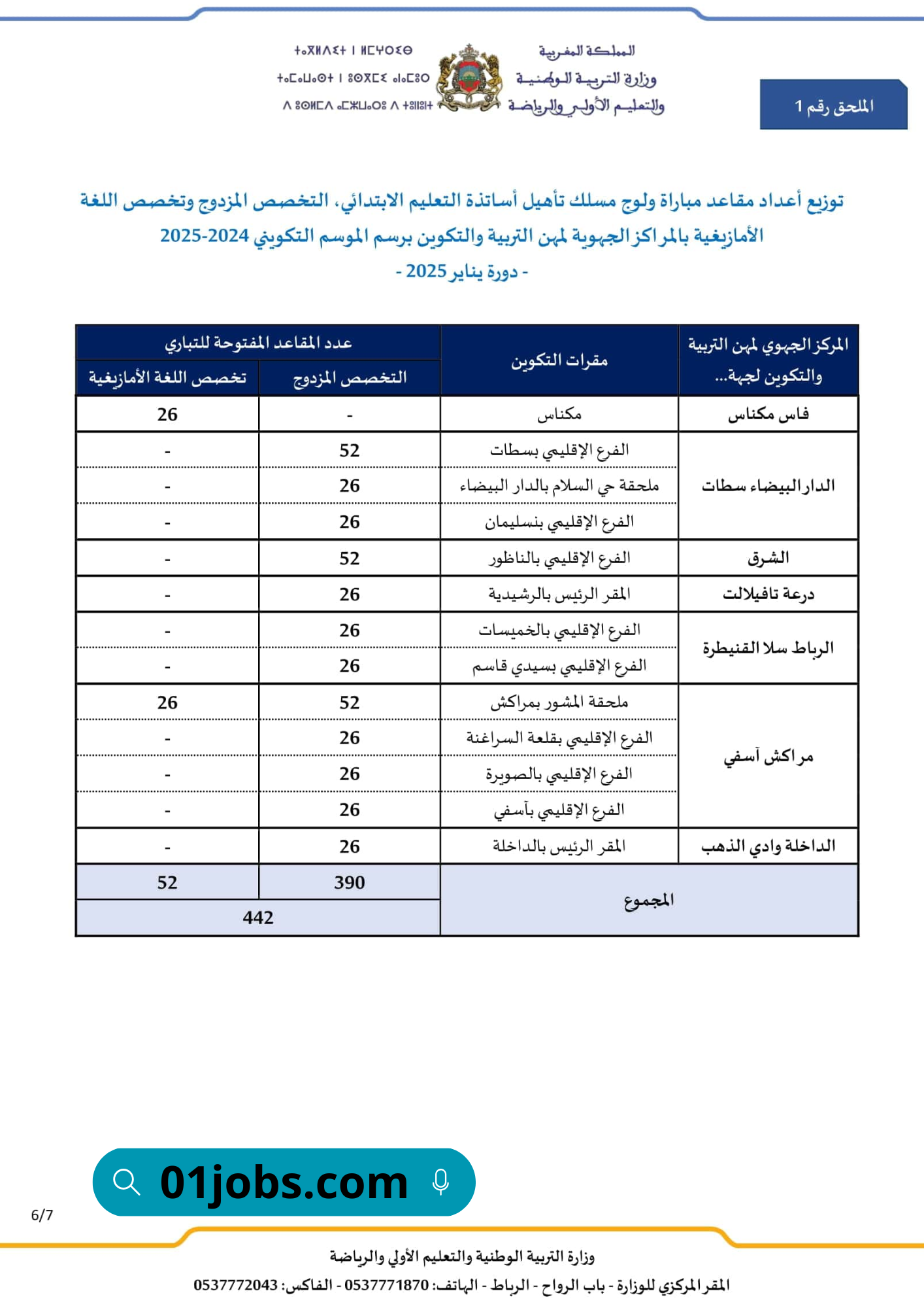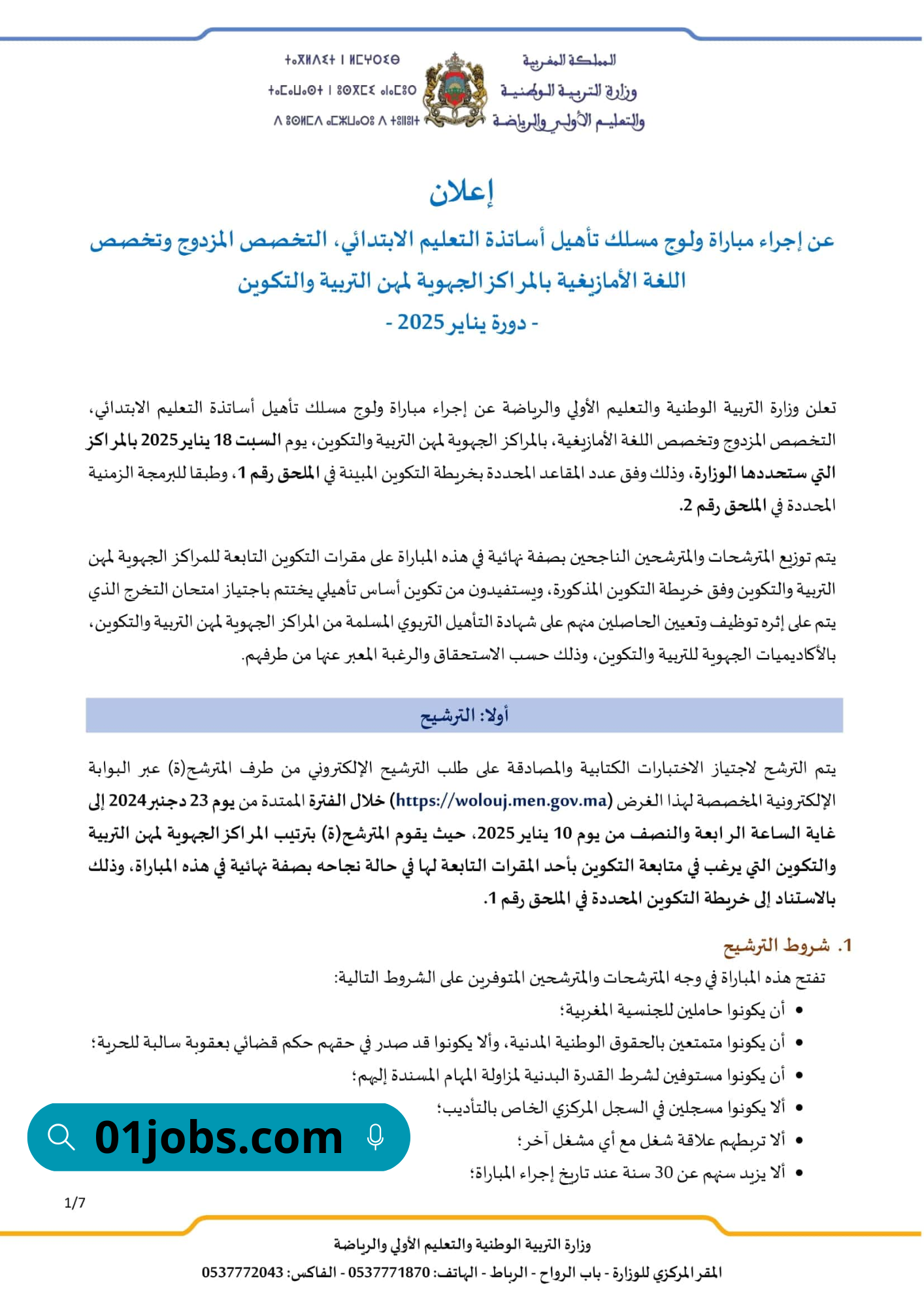 تستعد وزارة التربية الوطنية لتنظيم مباراة لولوج مسلك تأهيل أساتذة التعليم الابتدائي في المراكز الجهوية لمهن التربية والتكوين. يهدف هذا التكوين إلى تأهيل أساتذة متخصصين للعمل في التعليم الابتدائي، وخاصة في التخصصات المزدوجة واللغة الأمازيغية.