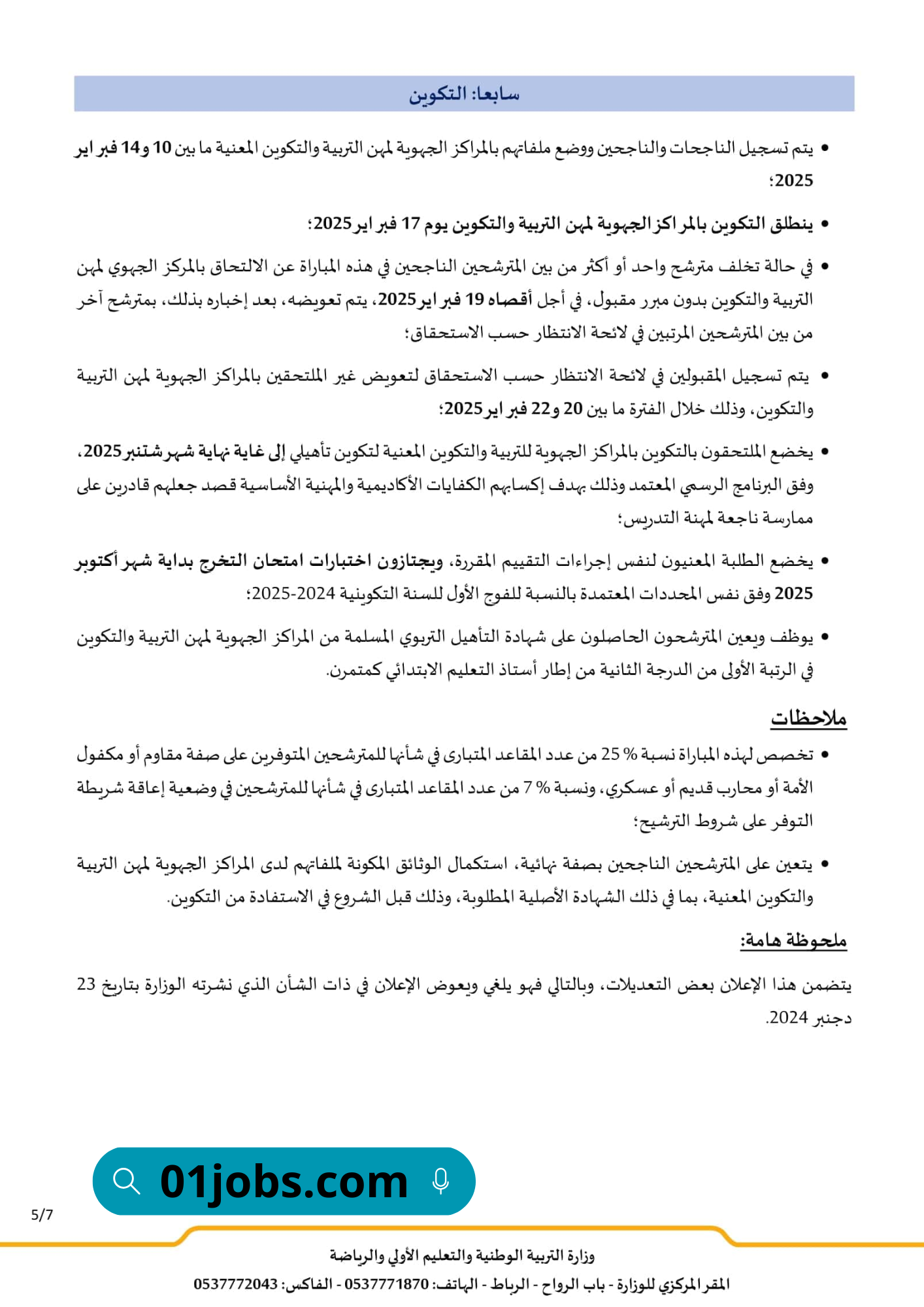 - مدة التكوين: يتم بعد التكوين التأهيلي إجراء امتحان التخرج، الذي يؤهل الناجحين للعمل في الأكاديميات الجهوية للتربية والتكوين، بناءً على الاستحقاق والرغبة.
